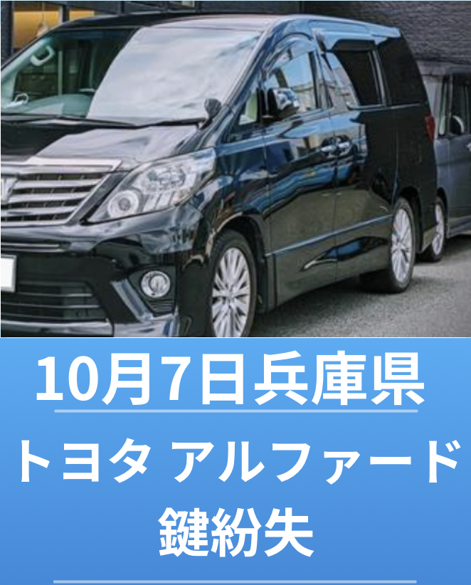 兵庫県内の道の駅でトヨタ・アルファードの鍵を紛失してしまい、他の鍵屋さんに電話するとスマートキーやイモビライザーの鍵はできないと言われ、お電話しました。電話してすぐに来て対応していただき、ありがとうございました!20代 坂口様